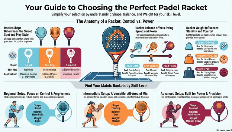 This complete buying guide breaks down everything you need to know — from racket shape and balance to weight, materials, and playing style — so you can confidently pick the right padel racket for your level and goals.